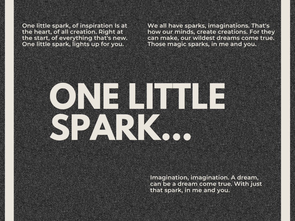 One Little Spark is a song, one of my favorites, and extremely annoying at times– it’s THE theme song for the ‘Journey Into Imagination’ Ride at Epcot in Disneyworld. My all-time favorite ride that features my favorite purple dragon. FIGMENT.
