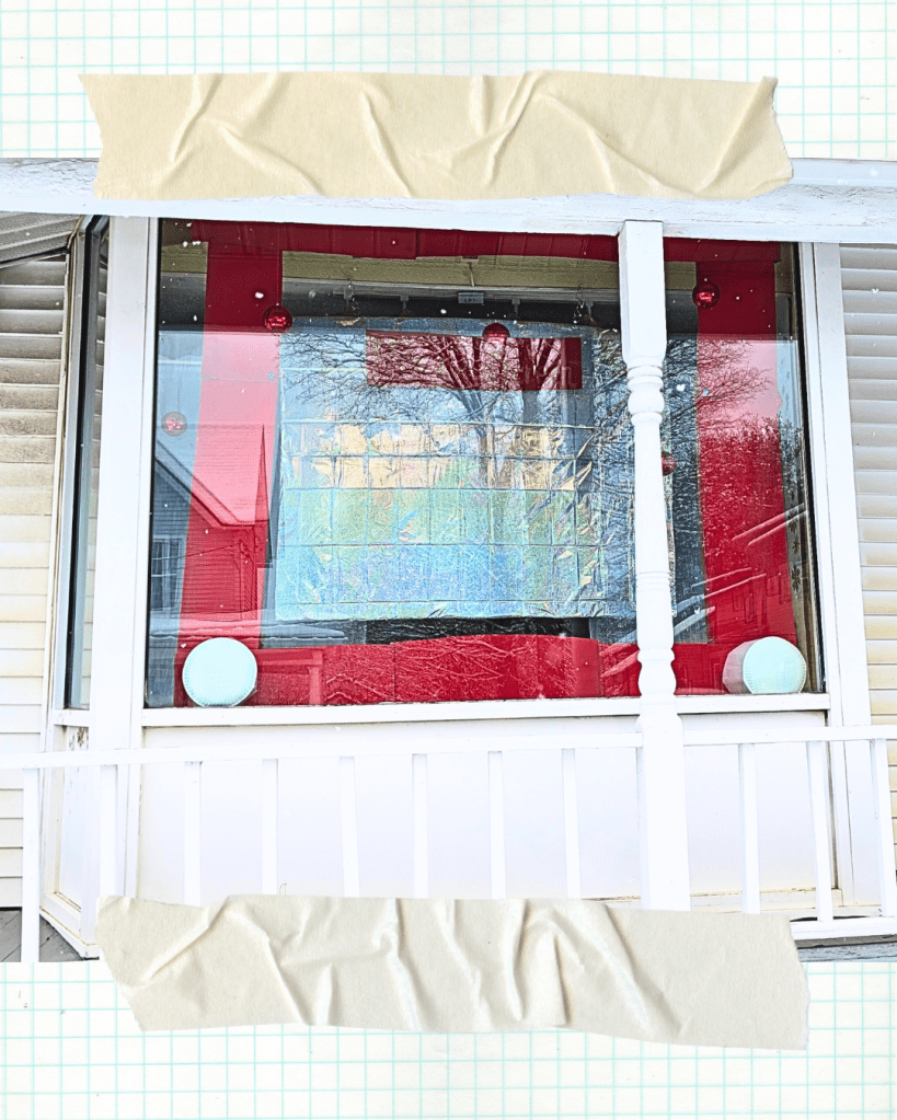 In January I felt the need to update my office window in town. I no longer am using the space as an office for a whole list of reasons, but I have a fabulous window on Main Street here in town. I had measured the center window and the 2 side panels. Stared at it, and suddenly decided a cardboard etch-a-sketch would become the installation.