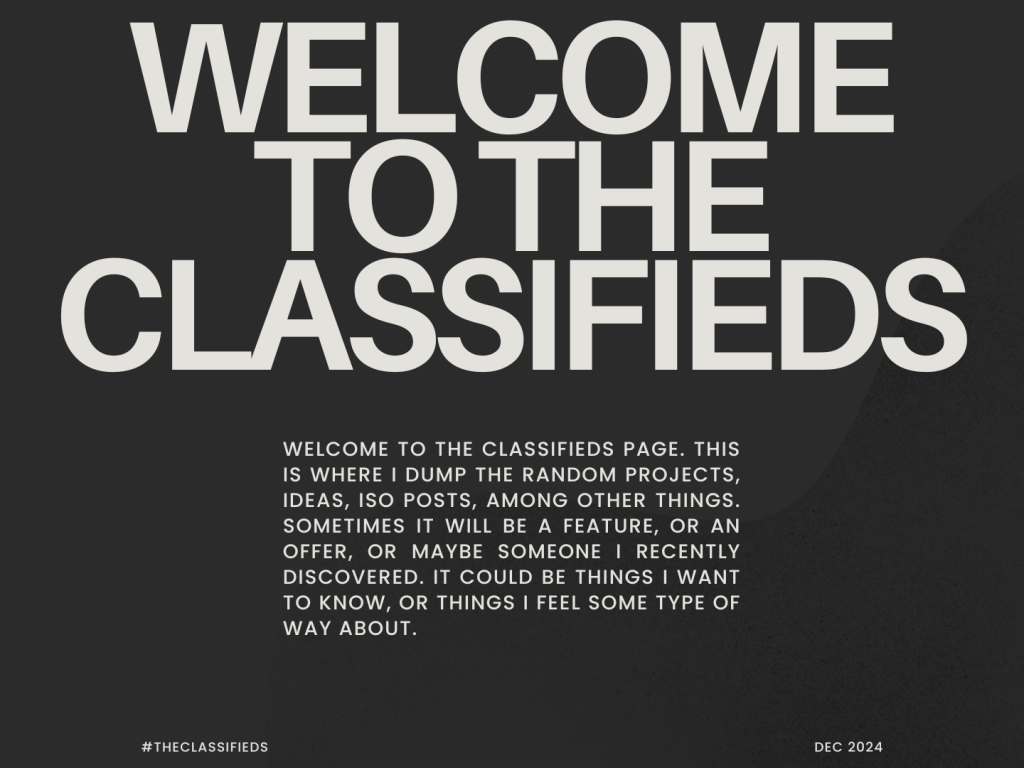 Welcome to THE CLASSIFIEDS page. This is where I dump the random projects, IDEAS, ISO posts (In search of), for sale, trades, among other things. it could be things I want to know, or things I feel some type of way about.